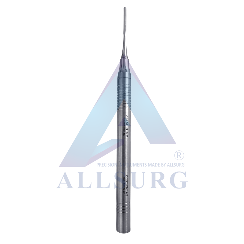 | Periotomes are specialized extraction instruments designed to be placed in the periodontal ligament space with vertical pressure along the long axis of the tooth root . These instruments are thinner with fine tapering Flexible blades that compress the alveolar bone, cut the membrane and gently ease the tooth from its socket. P2S is 2 mm straight blade. |